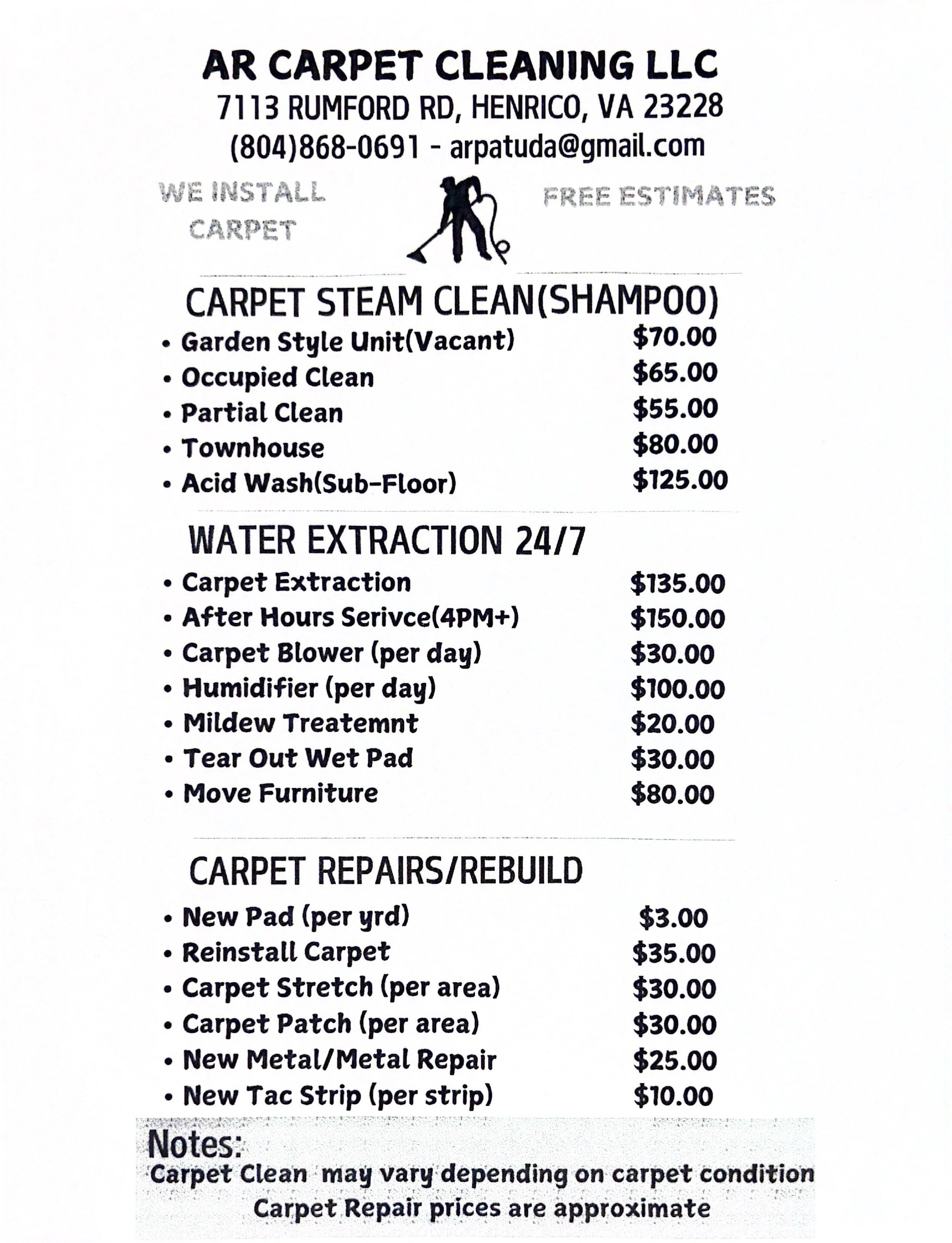 Some Services may not be included on here such as carpet installations, upholstery cleaning, and much more contact us for and questions on services wanted.